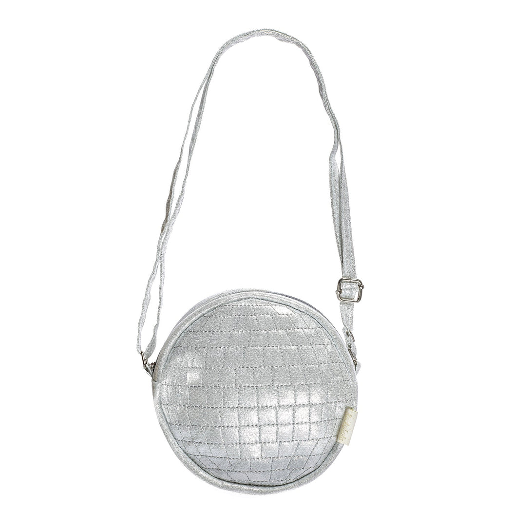 Get ready to dazzle under the disco ball! This bag is shaped like a disco ball and made in a sweet silver shimmering fabric. Featuring a zip closure, a starry lining and an adjustable silver fabric strap with a break point for safety. The perfect party accessory!