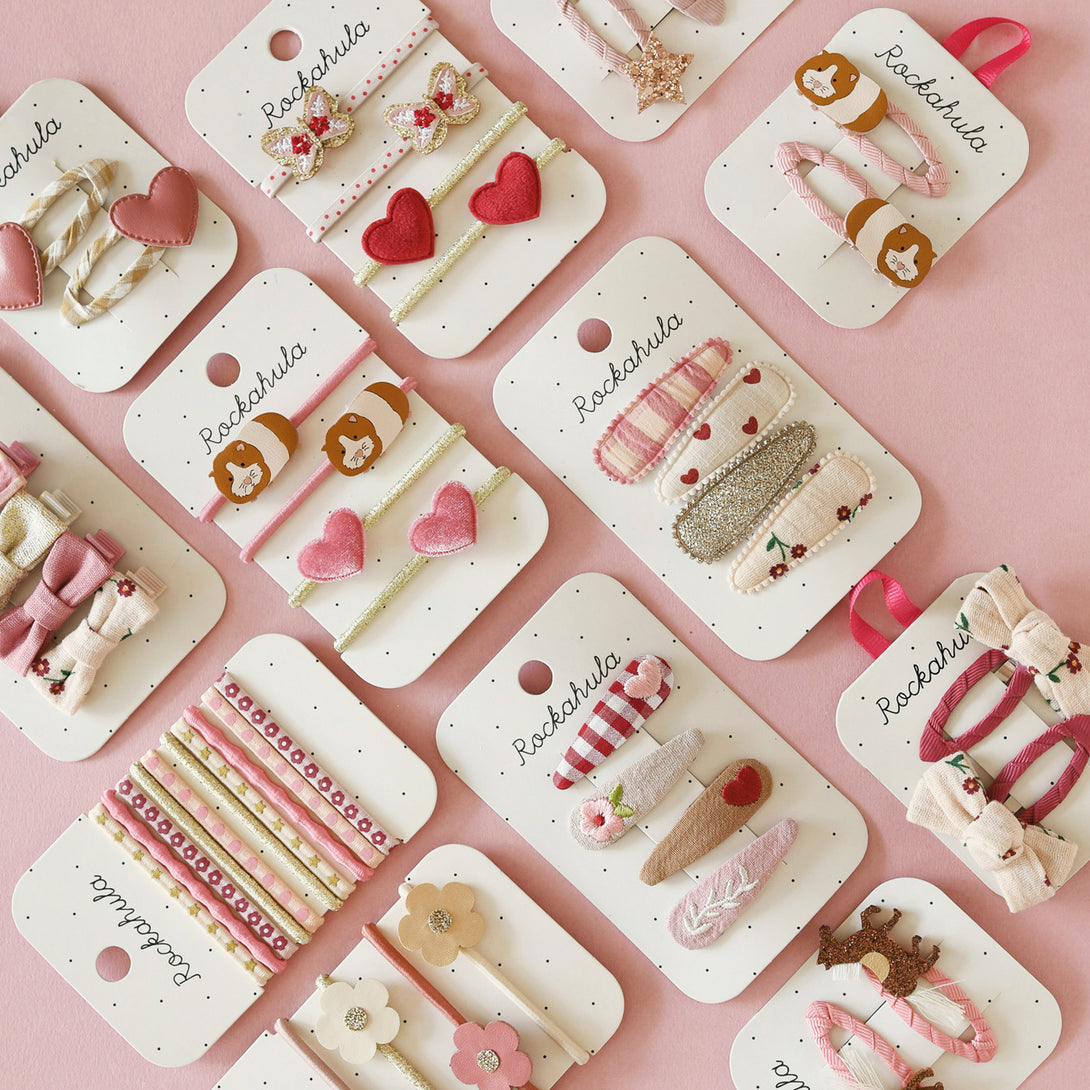This four pack of ponies feature our sweet little guinea pigs and the softest velvet hearts! Each little pig is delicately detailed with a soft pink nose, whiskers and teeny feet. Wear them one at a time ... or all at once!