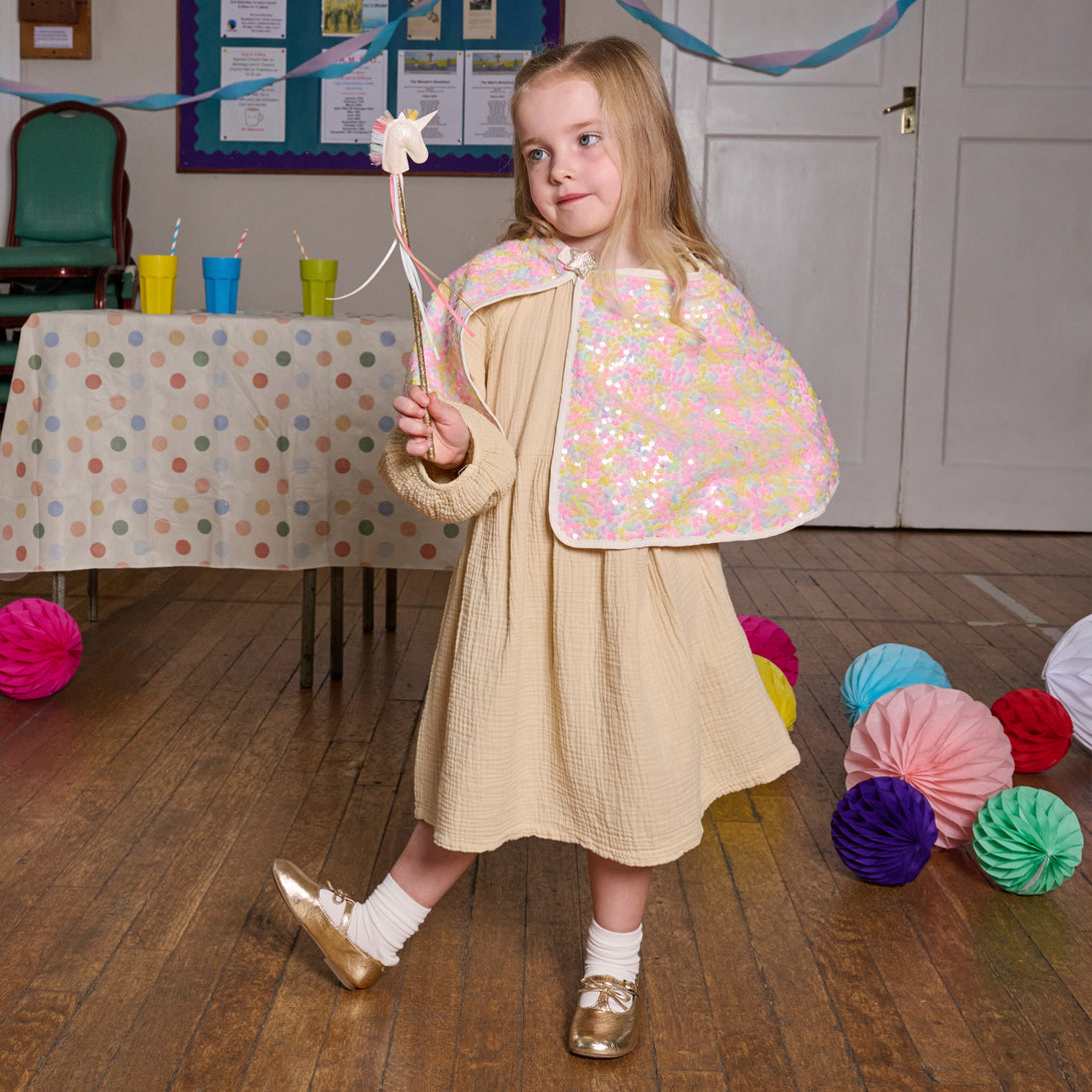 Get ready to dazzle with our pastel sequin cape! Adorned in shimmering pastel coloured sequins with a glittery gold star velcro closure. Fully lined with a gold starry lining, it's reversible for double the fun! The perfect accessory for summer adventures!