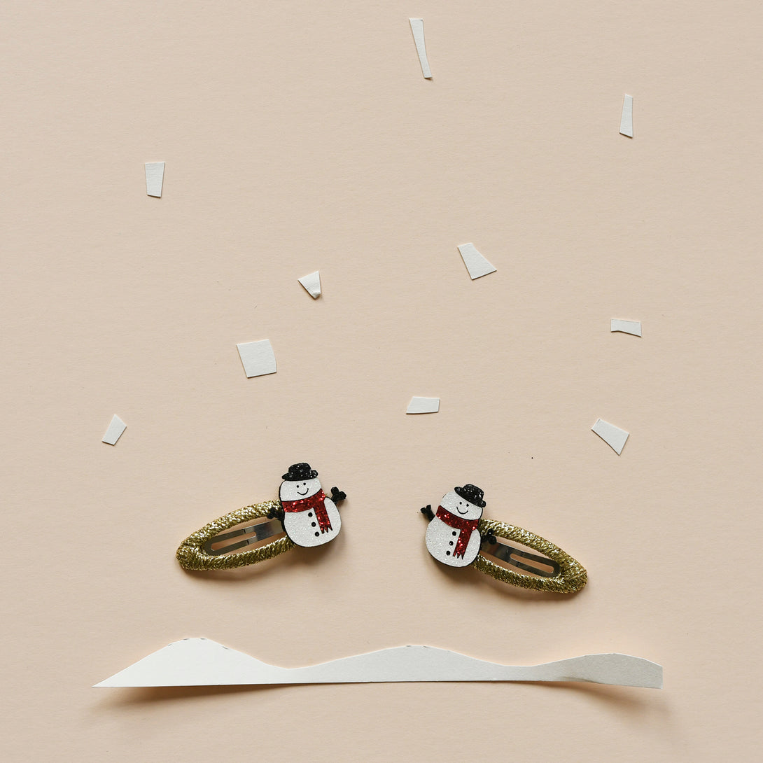 Our jolly snowman is made from a soft white glitter, and has a glittery scarf and top hat! Sat upon gold ribbon wrapped snap clips, these make the perfect snowy day accessory.