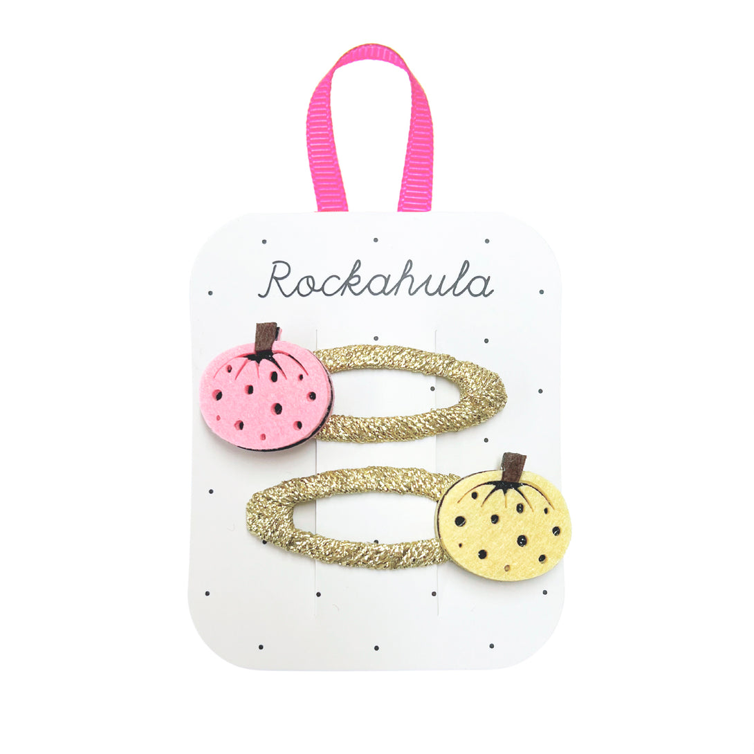 Our little spotty pumpkin clips are a super fun way to add a little halloween spirit to any outfit! In bubblegum pink and soft yellow, each pumpkin is decorated with sweet spots and is secured to gold ribbon wrapped snap clips.